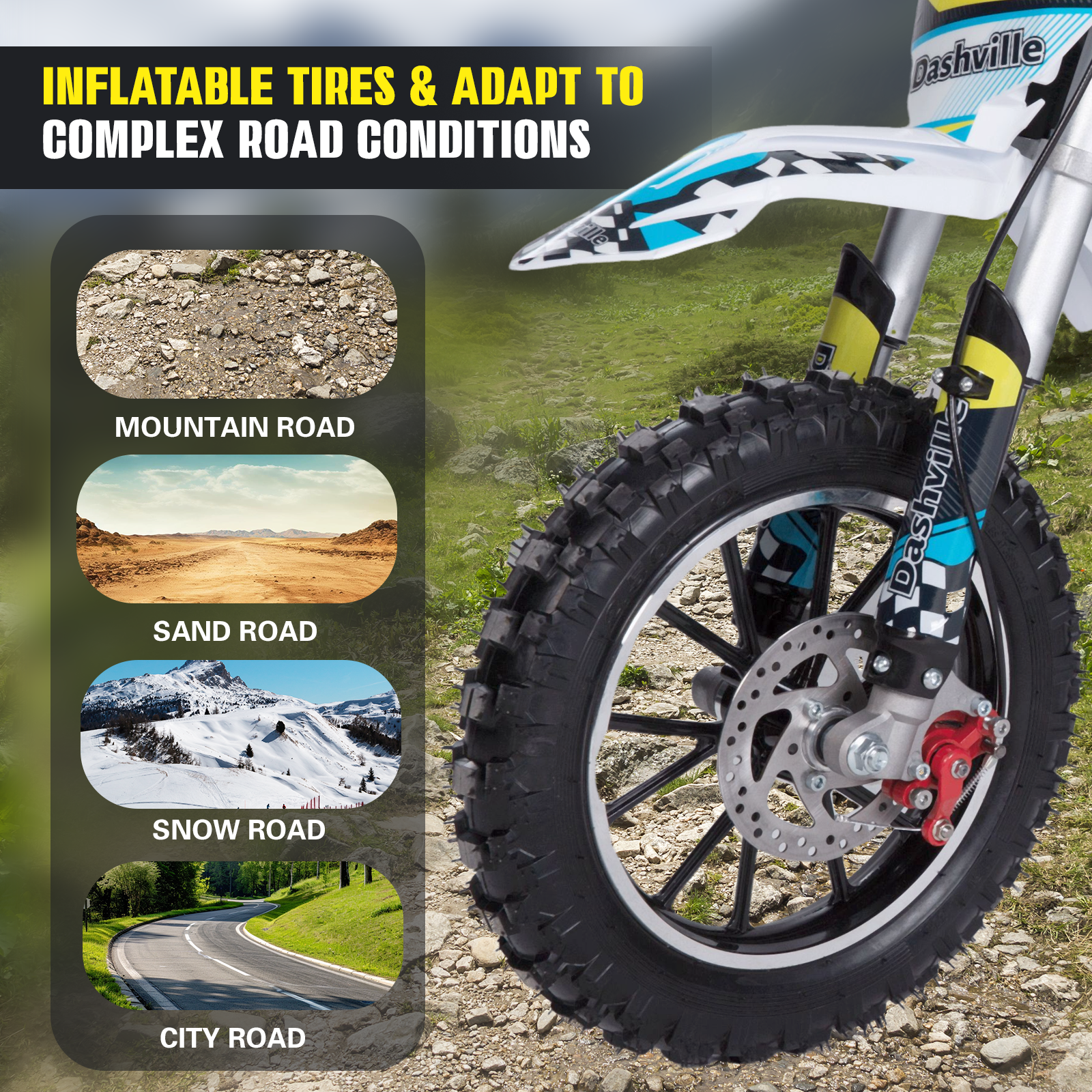 - High-Performance Dirt Bike Design: Equipped with safe anti-skid tires for adaptability to various terrains, the optimized design minimizes operational noise, improves riding comfort, and reduces environmental disturbance,The tight chain transmission structure allows adjustable chain tension, effectively preventing disengagement during acceleration or deceleration